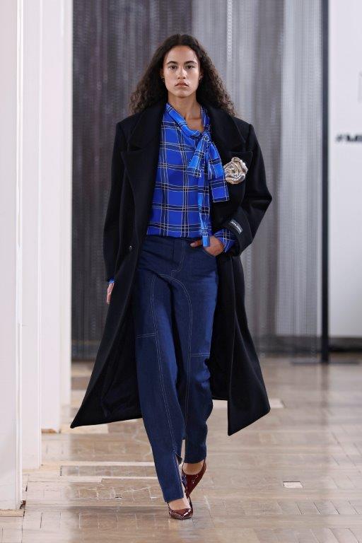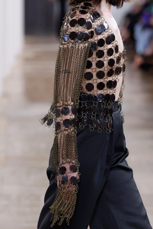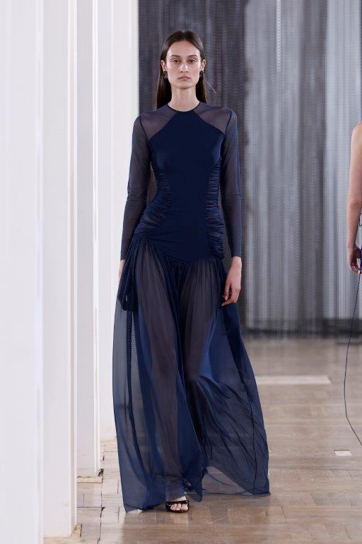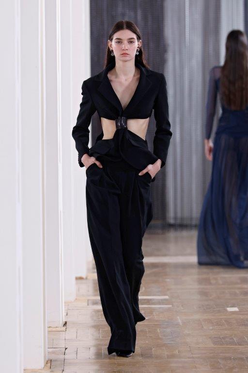 La colección presenta vestidos midi y largos —junto con algunas piezas mini—, abrigos, chalecos, chaquetas, trajes de pantalón y faldas que exploran un marcado contraste de proporciones: prendas muy cortas conviven con diseños hasta el tobillo y de largo al suelo. Las chaquetas se convierten en un elemento clave, alternando entre versiones extremadamente ajustadas y volúmenes oversized, mientras que corsés, prendas estructuradas y sujetadores integrados refuerzan el carácter arquitectónico de la colección. Parte de la propuesta se inclina hacia una estética más clásica, con vestidos de cóctel y de noche, mientras que otra introduce una lectura más contemporánea y experimental de las siluetas.