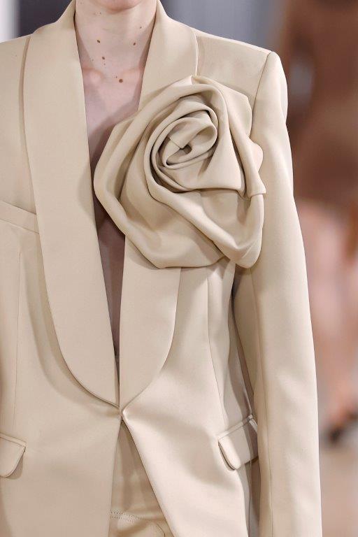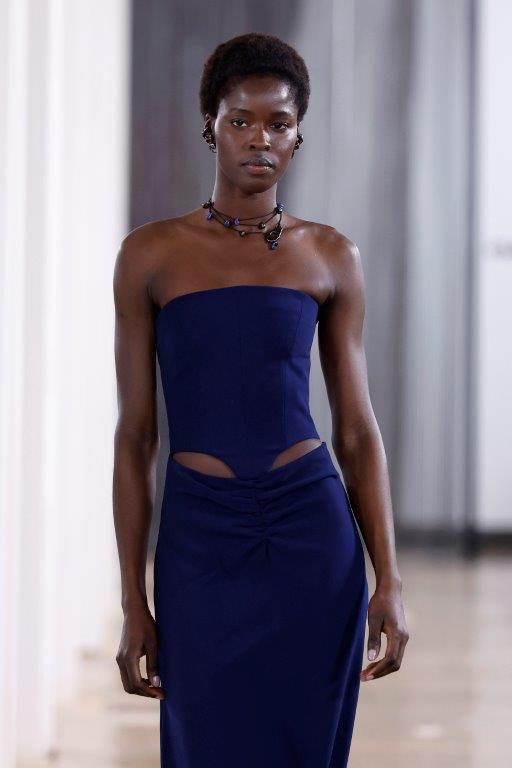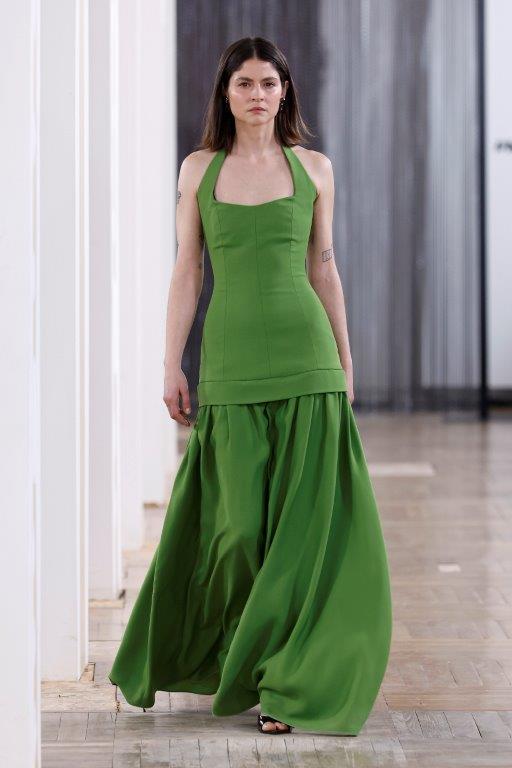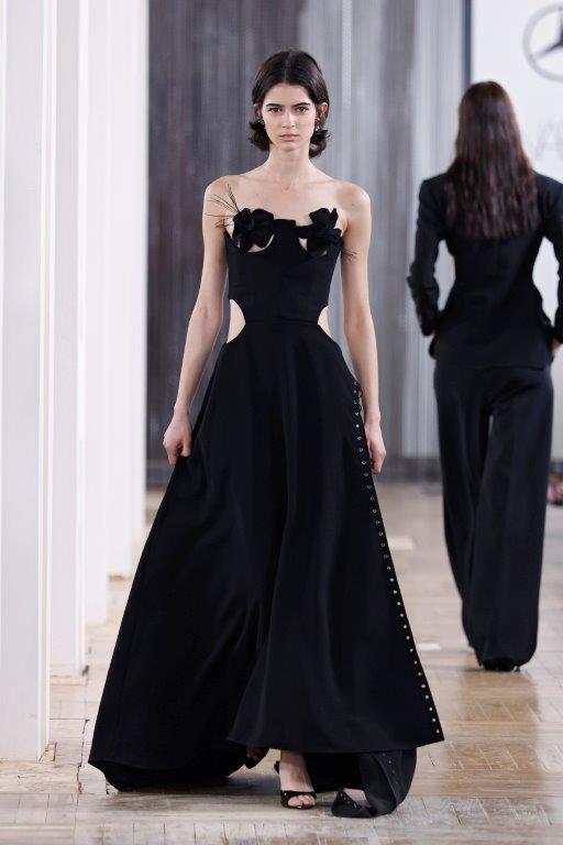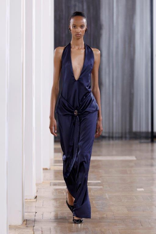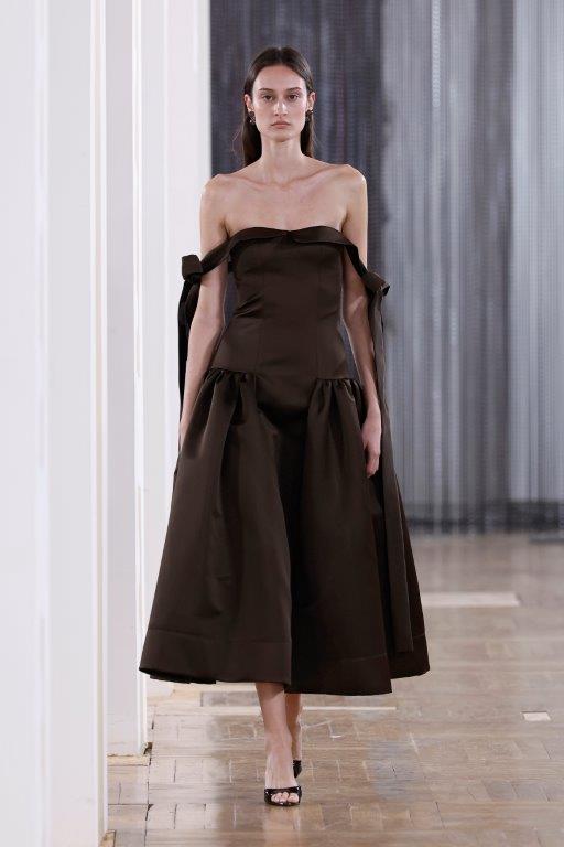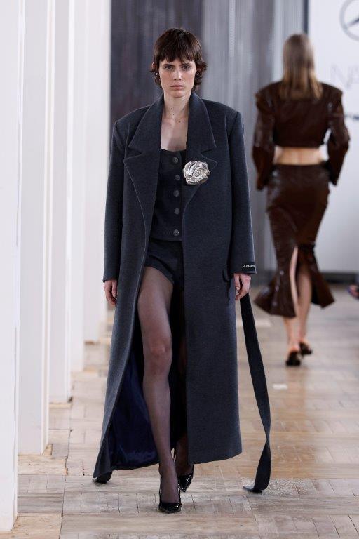 La colección presenta vestidos midi y largos —junto con algunas piezas mini—, abrigos, chalecos, chaquetas, trajes de pantalón y faldas que exploran un marcado contraste de proporciones: prendas muy cortas conviven con diseños hasta el tobillo y de largo al suelo. Las chaquetas se convierten en un elemento clave, alternando entre versiones extremadamente ajustadas y volúmenes oversized, mientras que corsés, prendas estructuradas y sujetadores integrados refuerzan el carácter arquitectónico de la colección. Parte de la propuesta se inclina hacia una estética más clásica, con vestidos de cóctel y de noche, mientras que otra introduce una lectura más contemporánea y experimental de las siluetas.