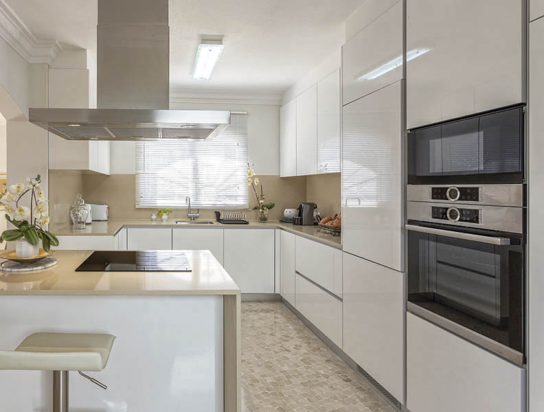 El blanco es el color luminoso por excelencia, así que no te equivocarás si eliges el “total white” para tu cocina, desde los muebles hasta los revestimientos de paredes y suelo. Otra buena idea es alternar los armarios altos con vitrinas de cristal translúcido que ayudarán a dar sensación de ligereza y amplitud.