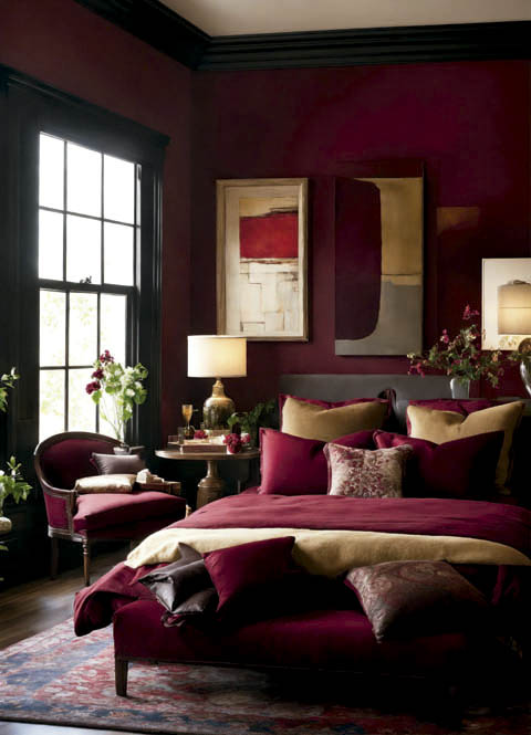 Colores intensos inspirados en gemas, como borgoñas, plums o rojos profundos, están ganando terreno, aportando sofisticación, emoción y personalidad a espacios íntimos. Son colores que funcionan bien en dormitorios, bibliotecas y espacios donde se quiere generar impacto emocional.