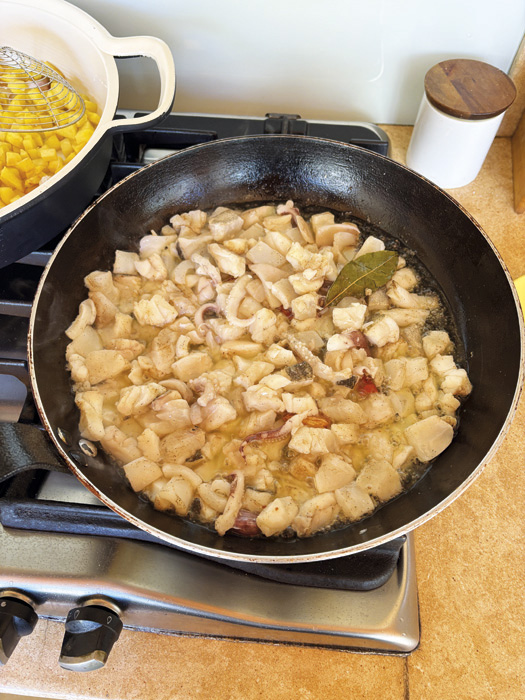 En una sartén vamos friendo las patatas cortadas al tamaño de los dados de parchís, junto con unos ajos para aromatizar el aceite. Cuando las patatas estén fritas las retiramos y las ponemos dentro de una cazuela de barro, o en una de esas negras tipo antiadherente. Revisamos la cantidad de aceite que nos queda en la sartén donde hemos frito las patatas, y si vemos que hay una gran cantidad, retiramos una parte y procedemos a freír las gambas. Una vez fritas las retiramos y vertemos con las patatas. También freímos el pescado y el calamar que habremos cortado a dados y salpimentado previamente, agregando a la mezcla unos ajos y unas hojas de laurel.