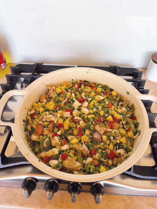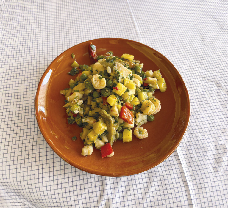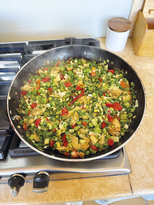 Cuando tengamos el pescado y el calamar en su punto lo retiramos y se lo añadimos a las patatas fritas. En este mismo aceite pochamos la cebolla, el pimiento y los guisantes, y una vez pochados incorporamos la cebolleta (con las colas y todo, no solamente la parte blanca) que habremos cortado a rodajas, y también las alcachofas.