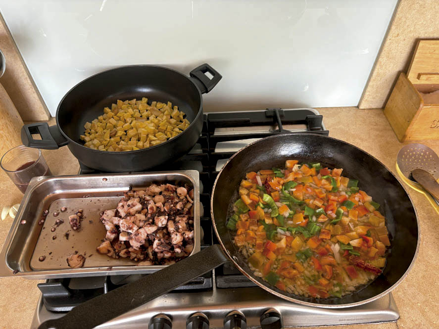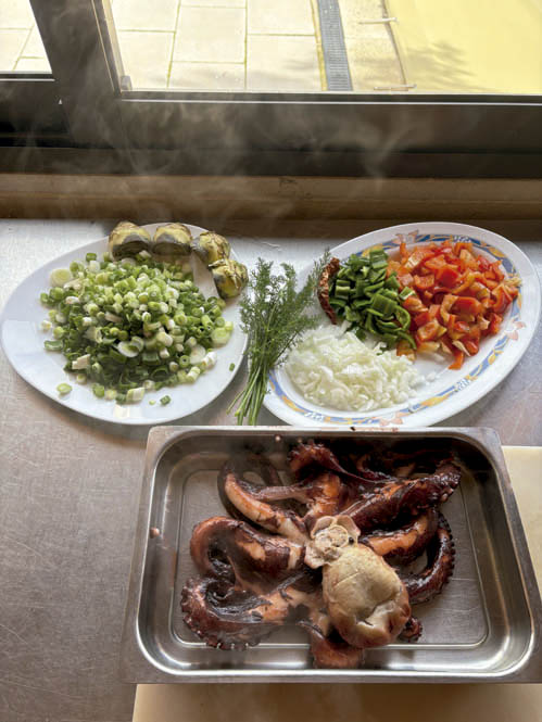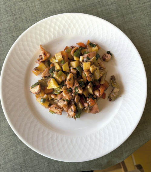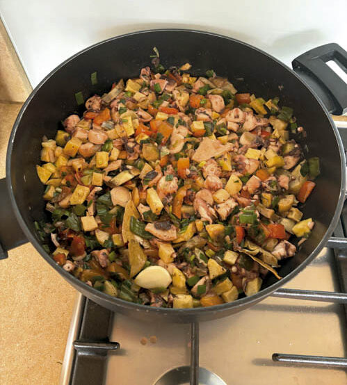 Por otro lado, sacamos el pulpo de la olla a presión y lo vamos cortando en trozos no muy grandes. Una vez cortado, lo incorporamos a la cazuela de las patatas y, si en la olla a presión queda algo del jugo del pulpo, podemos agregar un poco a la cazuela donde tenemos las patatas y donde añadiremos los demás ingredientes.