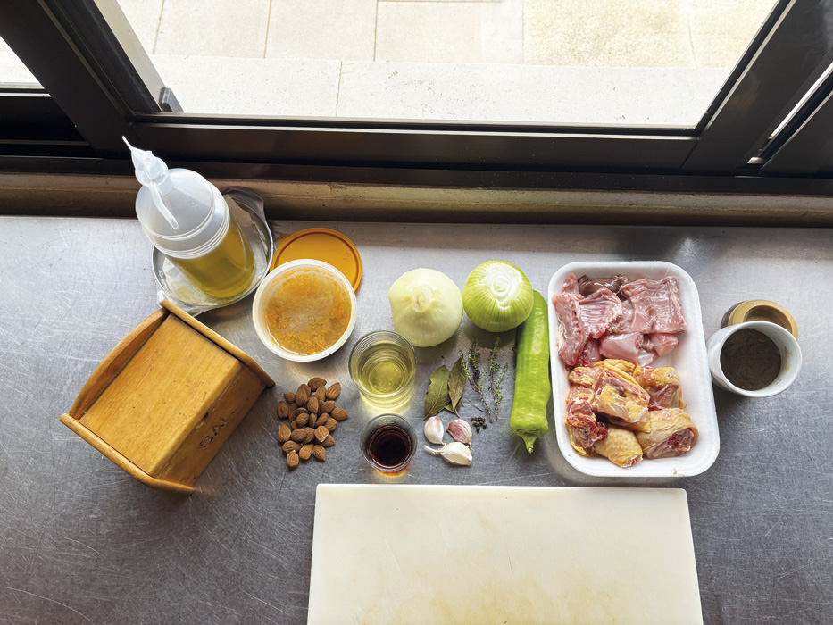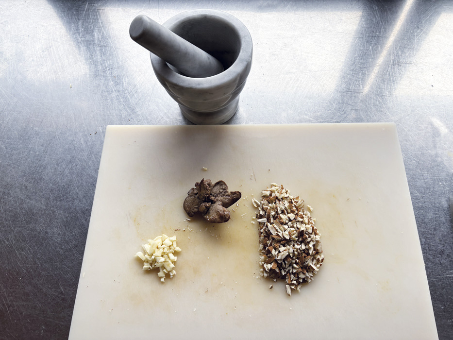 Por otra parte, en un mortero pondremos las almendras crudas y unos dientes de ajo, picamos bien fino y reservamos. Llegados a este punto hay gente que prefiere añadir a la almendra y el ajo, el hígado del conejo que previamente habremos pasado también por la cacerola. Yo opino que si habéis cocinado la carne con el caldo no es necesario potenciar más el sabor. Si en lugar de caldo habéis cocinado con agua tal vez sí es aconsejable añadir el hígado, pero es una elección muy particular ya que hay comensales que prefieren que el sabor no sea tan potente.
