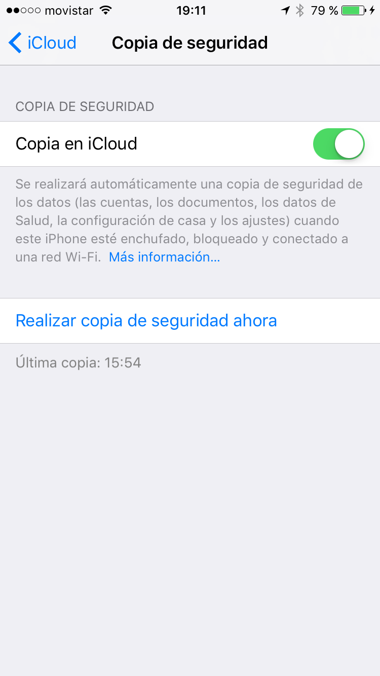Vía OTA (wifi). Debemos tener activado en nuestro dispositivo iCloud, para ello vamos a ‘Ajustes’ e introducimos nuestra ID de Apple y nuestra contraseña para activarlo. Seguimos hasta el final de la pantalla y buscamos ‘Copia de seguridad’, entramos en esa pestaña y ahí activamos ‘Copia en iCloud’. Marcamos ‘Otras aplicaciones’ a parte de los contactos que queremos respaldar y volvemos a la pantalla donde hemos activado iCloud para hacer ‘Copia de seguridad’. Una vez realizada la primera, realizará automáticamente una copia de seguridad, pero siempre tendremos que estar conectados bajo una red Wifi. Desde iCloud y accediendo desde nuestra cuenta podemos gestionar todos los dispositivos que usan nuestra misma ID de Apple y las copias de seguridad y tamaño que ocupan.