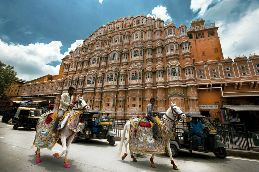 La ciudad rosa de Rajastán fue construida en estuco rosado para imitar la arenisca. Desde que en 1905 se repintaron sus edificios en color rosa para dar la bienvenida al príncipe de Gales, este color se considera un símbolo de la hospitalidad de Jaipur. Entre los lugares de mayor interés destaca el impresionante Hawa Mahal o Palacio de los Vientos, que alberga jardines y una laguna.