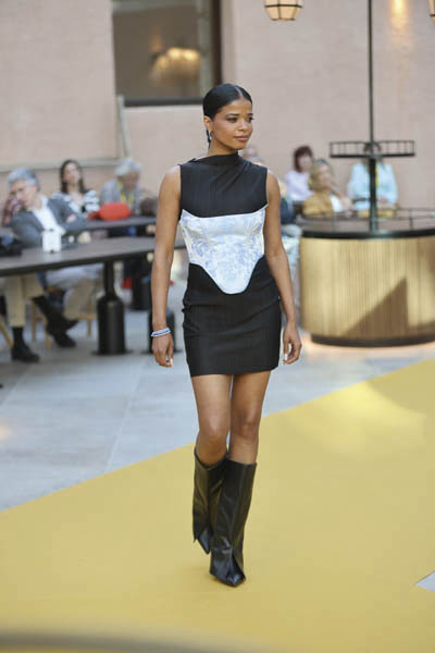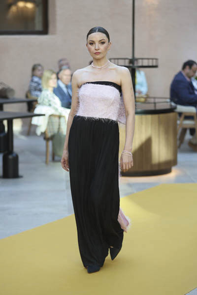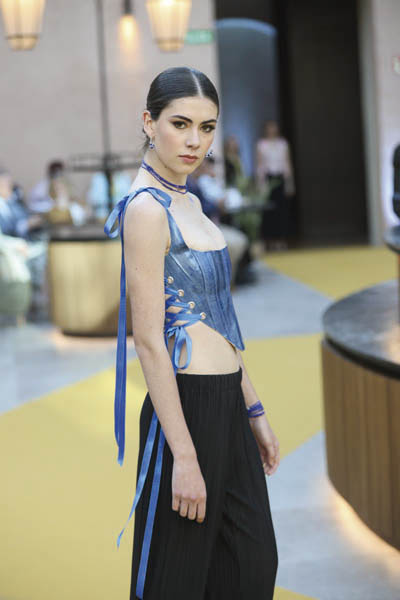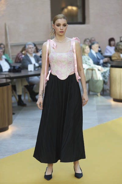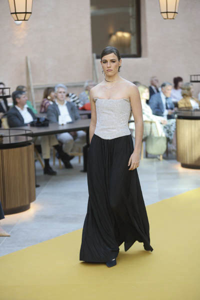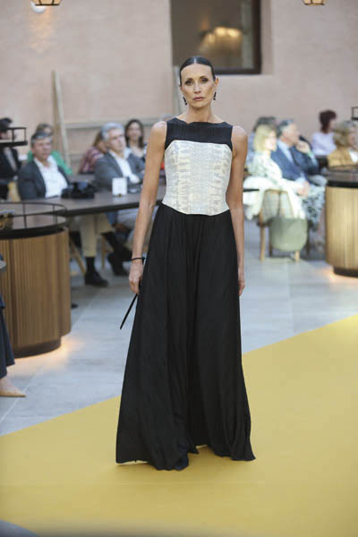 Bajo el título de “Serenza”, la firma Éclat by Andrea presentó una colección de siete piezas realizadas artesanalmente y de modo sostenible, en las que se mezcla la serenidad y la belleza: “La serenidad que aporta, tanto, el plisado -gracias a su textura, durabilidad, su capacidad de mantener la forma y su estética, única y clásica-, como el color negro y blanco, símbolo de elegancia, seguridad y confianza. Y por otro lado, la belleza que le aportan los colores y los tejidos de los corsés, que transmiten energía y seguridad”. Se trata de una colección que apuesta por la armonía entre la elegancia y el respeto por el medio ambiente, mediante el reciclado de tejidos.