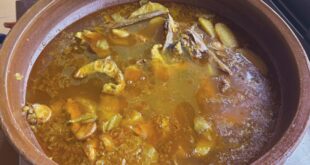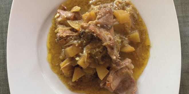 El plato que te propongo este mes es tan sabroso como aromático…¿Te animas a prepararlo? INGREDIENTES: 1 trasero de pollo campero troceado Medio conejo troceado 2 o 3 cebollas cortadas en juliana Ajos Medio pimiento verde (opcional) 2 patatas Un puñado de almendras crudas Unos granos de pimienta negra Sal …